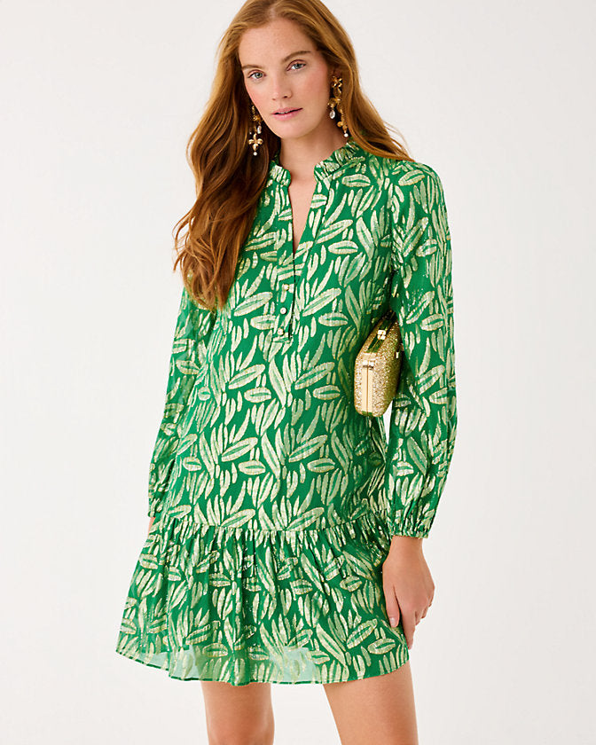 - Easy fit, long sleeve popover dress with a ruffle neckline, rhinestone buttons, and a hem ruffle.