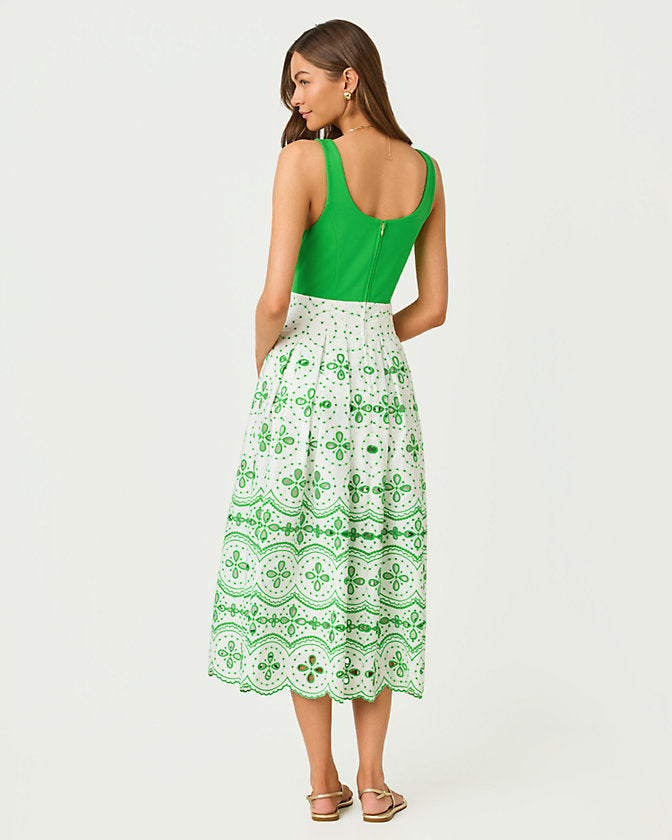- Fit-and-flare midi dress with a knit tank bodice, an eyelet skirt with a scalloped hem, and side seam pockets.