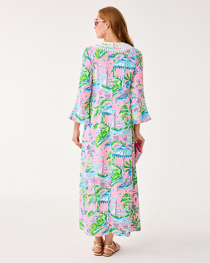 - Easy fit, v-neck, maxi caftan dress with flare sleeves, side slits, and a Lilly lace neckpiece.