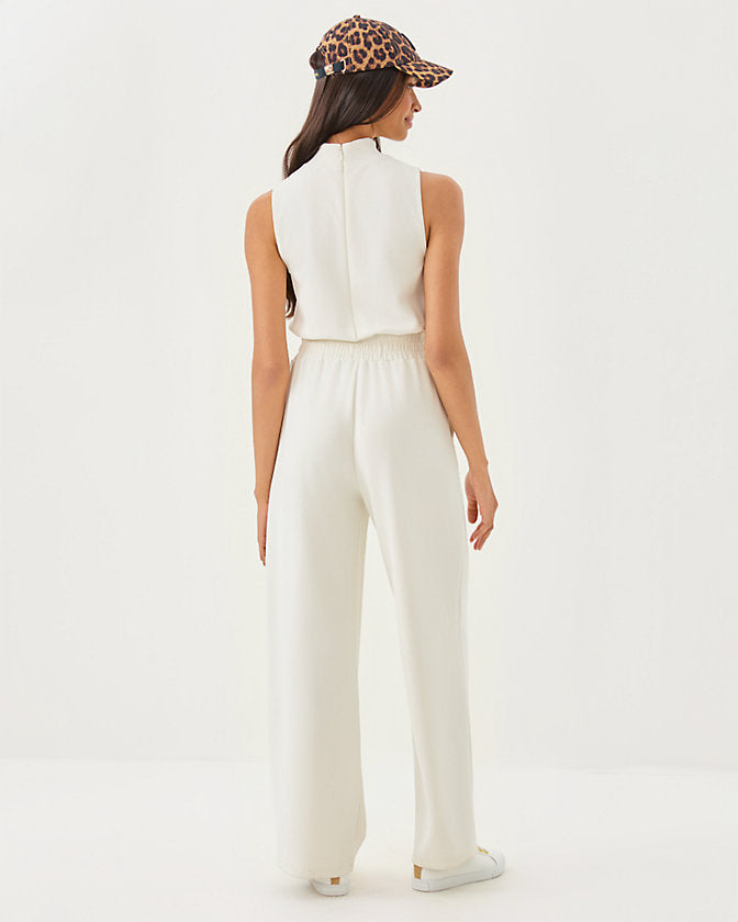 - UPF 50+ easy fit, wide leg jumpsuit with a drawcord waist and back zipper.
