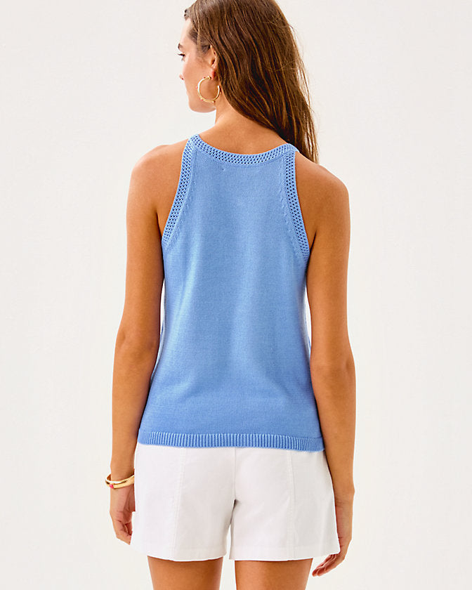 - Straight fit, halter neck tank with crochet trims and novelty jacquard.