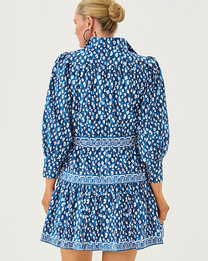 - Easy fit shirtdress with a button front, stand collar, and 3/4 length sleeves with tall cuffs. This style also features a hem ruffle and a separate sash.