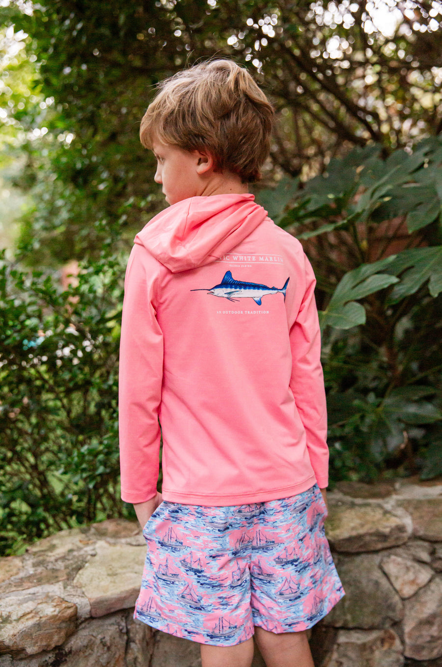 Our Boys Boogie Board Swim trunks in Shrimp Boat Print are made of soft, itch free fabric that boys and toddlers crave! Updated side slits and 4 way stretch fabric will provide more movement for your little guy this season! PRODOH Swim trunks are lightweight and fast drying and feature an anti chafing boxer brief liner.Side seam pockets are mesh lined so sand stays out but shells and bait stay put. Pair with a PRODOH sun protective Reef Rash Guard Swim Shirt from our boy's swimwear line or a lightweight youth performance t-shirt. Swim Trunks are available in custom designed fabric prints in sizes 12 Month - Youth Large 12/14 for toddlers and boys.