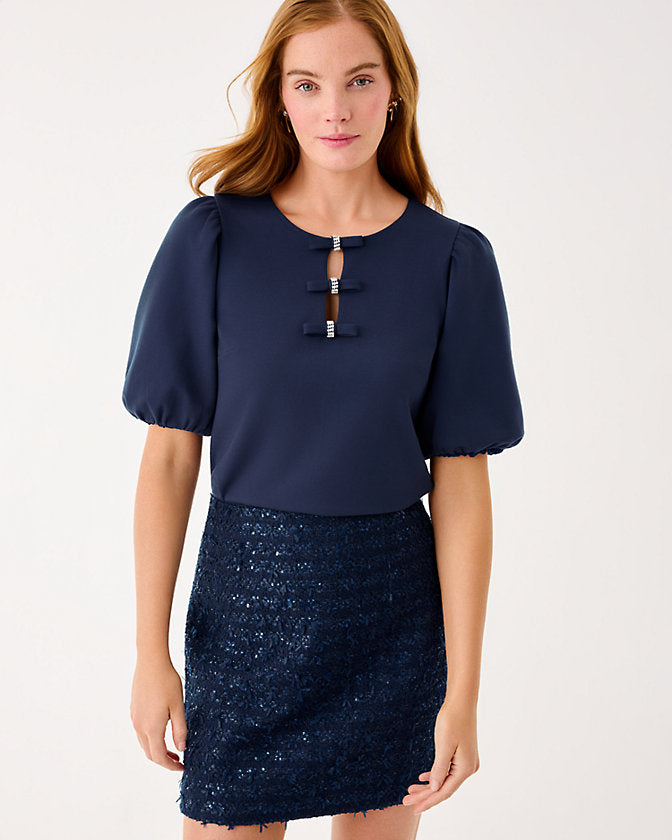 • Straight fit top with a front keyhole, puffed sleeves, embellished front bows, and a back zipper.